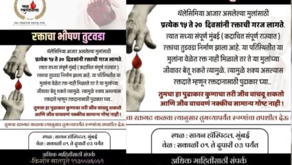 याच समस्येवर मुंबई आणि उपनगरात मोठ्य़ा प्रमाणात रक्तदान शिबिर होण्यासाठी सामाजिक संघटना देखील आता पुढे सरसावल्य़ा आहेत. यातील एक सामाजिक संस्था ‘लढा रक्तदानाचा’ यांच्य़ा वतीने सायन रुग्णालयात रक्तदान करण्याचं आवाहन करत आहे.शस्रक्रिया आणि अपघात या व्यतिरिक्त देखील रक्ताची गरज असते ते थॅलेसेमियाच्या रुग्णांना. या रुग्णांना तब्बल 15 ते 20 दिवसांनी रक्ताची सतत गरज असते. अन्यथा यांच्या जीवाला धोका निर्माण होतो. याचमुळे ‘लढा रक्तदानाचा’ या संस्थेने थॅलेसेमियाने ग्रस्त असलेल्या मुलांच्या भविष्यासाठी नागरिकांनी रक्तदान करावं. तसंच सोसायटी आणि कामाच्या ठिकाणी देखील रक्तदान शिबिराचं आयोजन करण्यासाठी काही मदत हवी असल्याचं संपर्क करु शकता असं देखील सांगितलं आहे.