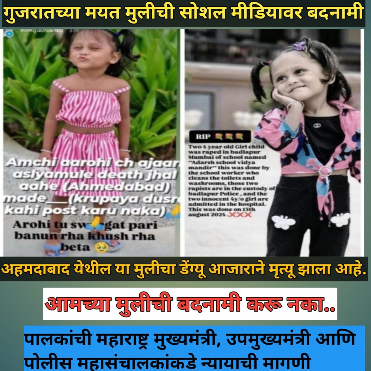आरोही अविनाश जाधव वय 4 वर्षे तिचा नरोडा पाटिया अहमदाबाद येथील ऍपल इन्स्टिट्यूट ऑफ चाइल्ड हेल्थ येथे मृत्यू झाला 20-08-2024 रोजी मृत्यू झाला आहे. दुपारी 12:10 वाजण्याच्या सुमारास डेंग्यू गाल ग्युरफ्रॉम या आजाराने मृत्यू झाला. नातेवाईकांकडून, बदलापूर मुंबई येथील शालेय विद्या मंदिर येथे 4 वर्षाच्या मुलीवर बलात्कार झाल्याची पोस्ट विविध सोशल मीडिया प्लॅटफॉर्मवर मोठ्या प्रमाणात प्रसारित झाली. दुर्दैवाने, ही पोस्ट गुजरात येथील दिवंगत आरोही अविनाश जाधव हिचा फोटो संशयास्पद लोकांद्वारे व्हायरलं केली होती आणि तेव्हापासून ती व्हायरल झाली आहे, ज्यामुळे विनाकारण नकारात्मक लक्ष, माझ्या चारित्र्याची बदनामी झाली असल्याची तक्रार दाखल केली आहे.बदलापूर येथील पालकांचा आक्रोश पाहता, गुजरात अहमदाबाद येथील आमच्या गरीब कुटुंबाची बदनामी थांबविण्यासाठी पालकांनी महाराष्ट्र मुख्यमंत्री यांच्याकडे विनवणी केली आहे.