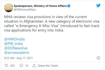 दरम्यान, अफगाणिस्तानातून भारतात येणाऱ्या लोकांसाठी गृह मंत्रालयाने व्हिसाचे नियम बदलले आहेत. सध्याची परिस्थिती पाहता, इलेक्ट्रॉनिक व्हिसा ई-इमर्जन्सी एक्स-मिस्क व्हिसाची नवीन श्रेणी सुरू करण्यात आली आहे. अफगाणिस्तानातून भारतात येणाऱ्या लोकांना लवकरात लवकर व्हिसा मिळावा म्हणून ही सुविधा सुरू करण्यात आली आहे.