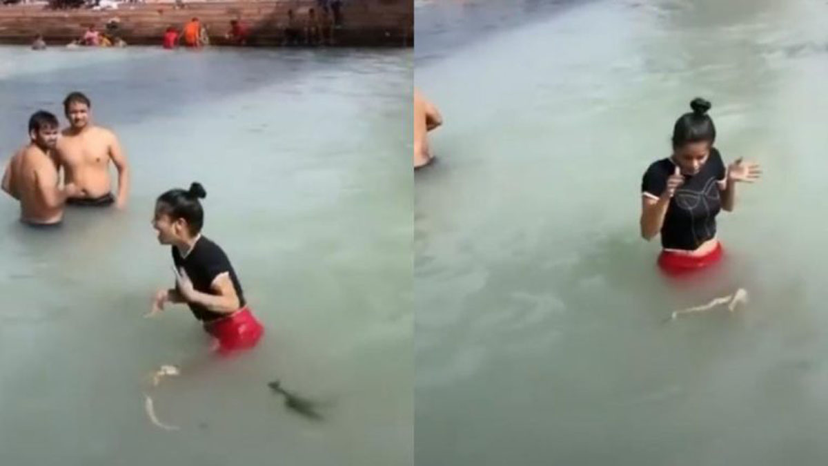 तरुणी गंगेत आंघोळ करत असताना तिच्याजवळ एक सापासारखं दिसणारं काही तर वाहत आलं. त्यानंतर ती खूप घाबरली आणि जोरजोरात ओरडू लागली. ती पाण्यातून बाहेर पडली.
