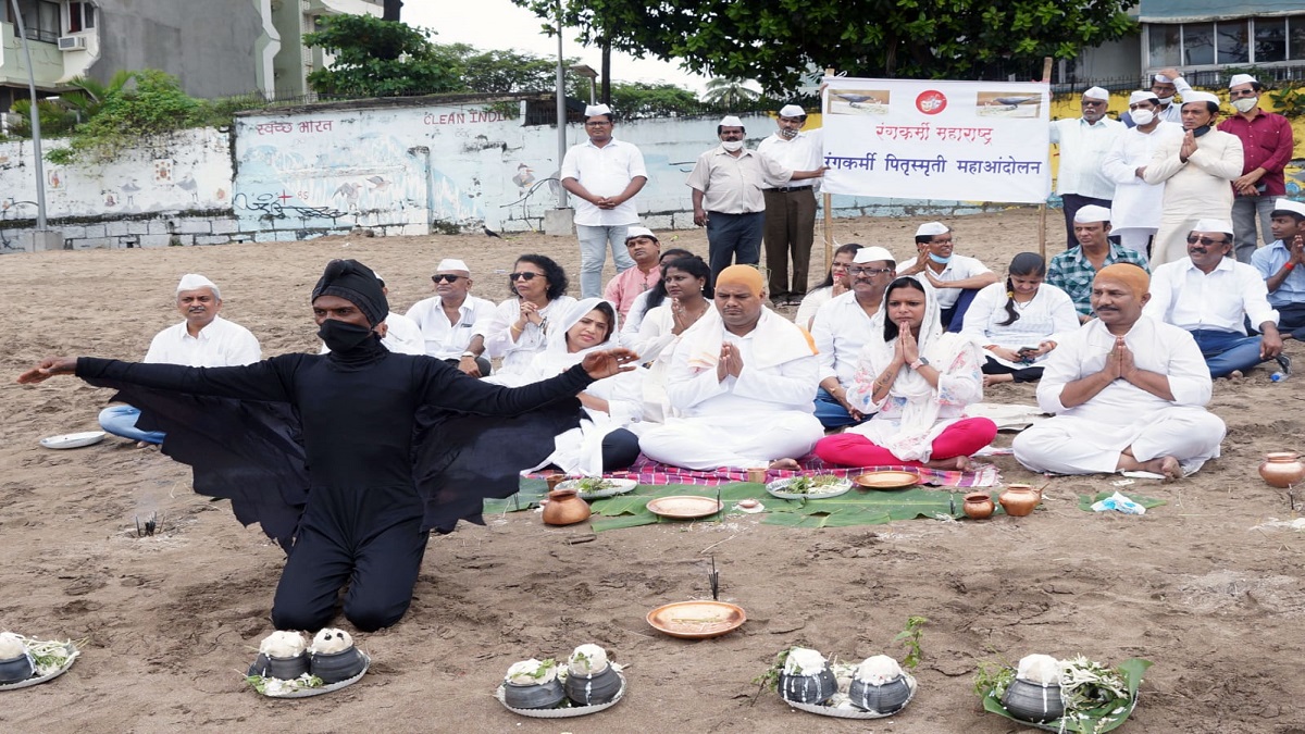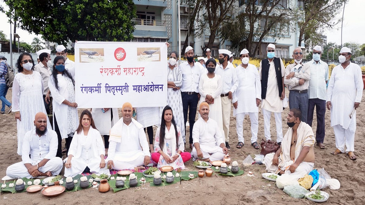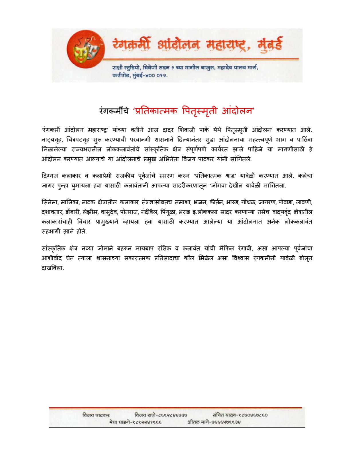 मुंबई : ‘रंगकर्मी आंदोलन महाराष्ट्र’ (Rangkarmi Andolan Maharashtra) यांच्या वतीने आज दादर शिवाजी पार्क (Shivaji Park Dadar, Mumbai) येथे पितृस्मृती आंदोलन’ (PitruSmriti Andolan) करण्यात आले. नाट्यगृह (Drama Theaters), चित्रपटगृह (Cinema theaters) सुरू करण्याची परवानगी शासनाने दिल्यानंतर सुद्धा आंदोलनाचा महत्त्वपूर्ण भाग व पाठिंबा मिळालेल्या राज्यभरातील लोककलावंतांचे सांस्कृतिक क्षेत्र संपूर्णपणे कार्यरत झाले पाहिजे या मागणीसाठी (Andolan For the demand that the cultural field of folk artists should be fully functional) हे आंदोलन करण्यात आल्याचे या आंदोलनाचे प्रमुख अभिनेता विजय पाटकर (Actor Vijay Patkar) यांनी सांगितले.