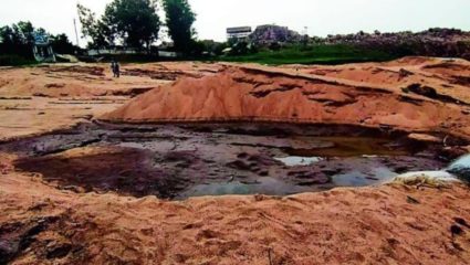 तुमसर (Tumsar) तालुका मुख्यालयापासून केवळ आठ किलोमीटर अंतरावर माडगी येथील वैनगंगा नदीपात्र (The Wainganga river) रेती तस्करांनी अक्षरश: पोखरून टाकले आहे. उत्खनन केलेल्या रेतीचा स्मशानघाट परिसर व गावाच्या प्रवेशद्वाराजवळच साठा केला आहे. पोखरलेल्या नदीपात्रामुळे (the pond) गावाला पुराचा धोका (risk of floods) निर्माण झाला आहे.