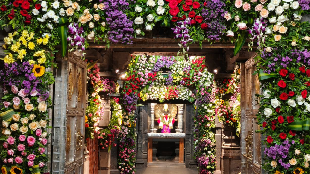 या फुलांमध्ये, कोंडा, शेवंती, अष्टर, गुलाब, ऑर्किड, अँथोनीयम, जिप्स, सायकस, गुलछडी, इत्यादी फुलांचा समावेश असून या सर्व फुलांद्वारे श्री विठ्ठल-रुक्मिणी मंदिराचा परिसर रंग, सुगंध आणि भक्तीभावाने उजळून निघाला आहे. मंदिरातील श्री विठ्ठल चौखांबी, सोळ खांबी परिसर, रुक्मिणी मातेचे मंदिर, तसेच प्रवेशद्वार,या सर्व भागात कलात्मक डेकोरेशन करण्यात आले आहे. पारंपारिक आणि आधुनिक फुलांच्या रचना यांचा सुंदर संगम भाविकांना एक अद्भुत दृश्यानुभूती देत आहे.