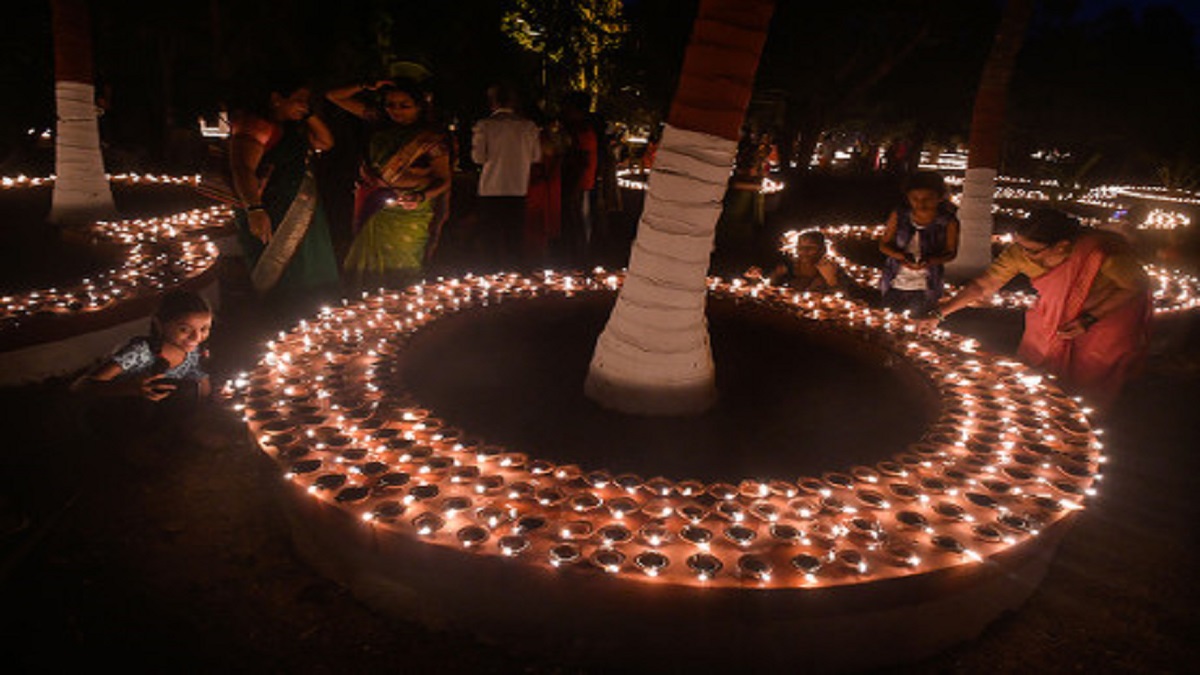 Mandatory Credit: Photo by Shashi S Kashyap/Hindustan Times/Shutterstock (9944741i) People participate in Laksha Deepotsava 2018 at Swami Gagangiri Ashram, Manori, Malad on October 23, 2018 in Mumbai, India. Thousands of oil lamps lit by devotees. Laksha Deepotsav, Mumbai, India - 23 Oct 2018