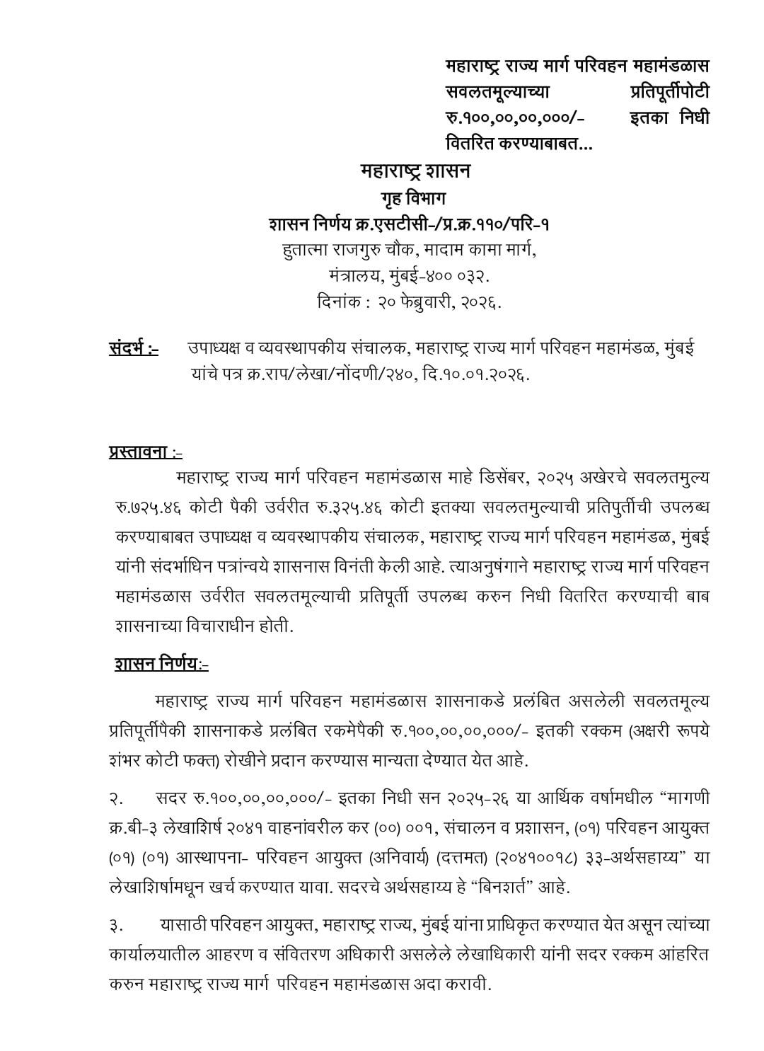 सदर गंभीर परिस्थिती ओळखून परिवहन मंत्री तथा एसटी महामंडळाचे अध्यक्ष प्रताप सरनाईक यांनी दोन्ही उपमुख्यमंत्री व मुख्यमंत्री यांचीशी चर्चा करून या थकीत हप्त्यापोटी २१० कोटी रुपये तातडीने सरकारने एसटीला द्यावेत अशी विनंती केली. त्याचा सातत्याने पाठपुरावा देखील केला. त्यामुळे त्या २१० कोटी रुपयांपैकी १०० कोटी रुपये आज शासनाने दिले असून उर्वरित निधी देखील लवकरच प्राप्त होईल त्यामुळे कर्मचाऱ्यांच्या थकीत वेतनाचे हप्ते कोणते परिस्थितीमध्ये देण्यात येतील असे ठाम आश्वासन मंत्री प्रताप सरनाईक यांनी शासनाच्या वतीने दिले आहे. तसेच सध्या दहावी व बारावीच्या मुलांच्या परीक्षा सुरू असल्यामुळे त्यांच्या प्रवासात कोणते अडथळा निर्माण होऊ नये यासाठी काही संघटनांनी पुकारलेले आंदोलन तातडीने स्थगित करावे. असे देखील आवाहन त्यांनी यावेळी केले आहे.