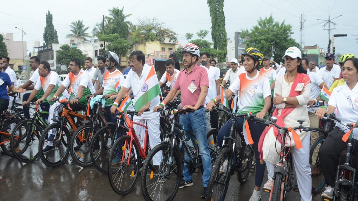 प्रारंभी आसरा चौक येथे जिल्हाधिकारी कार्यालय व पोलीस अधीक्षक कार्यालयातील अधिकारी व कर्मचारी सकाळी मोठ्या संख्येने उपस्थित झालेले होते. पाऊस सुरू असतानाही हर घर तिरंगा मोहिमेअंतर्गत सायकल रॅलीस सुरुवात झाली. भर पावसात रॅलीमध्ये सहभागी अधिकारी व कर्मचारी यांच्यामध्ये जनजागृतीपर सायकल रॅलीसाठी मोठा उत्साह दिसून येत होता. प्रमुख अधिकाऱ्यांच्या आसरा चौक येथून रॅलीस प्रारंभ झाला ही रॅली विमानतळमार्गे सिद्धेश्वर कारखाना समोरून होटगी गाव पर्यंत गेली. यावेळी होटगीचे सरपंच श्रीमती लक्ष्मीबाई गायकवाड, उपसरपंच असीम शेख व ग्रामस्थांनी या जनजागृतीपर सायकल रॅलीमध्ये सहभागी अधिकारी कर्मचाऱ्यांचे मोठ्या उत्साहाने स्वागत केले. होटगी ग्रामपंचायतीच्या वतीने आयोजित कार्यक्रमात जिल्हाधिकारी शंभरकर व आमदार देशमुख व अन्य मान्यवरांच्या हस्ते ग्रामस्थांना भारतीय राष्ट्रध्वजाचे वितरण करण्यात आले.