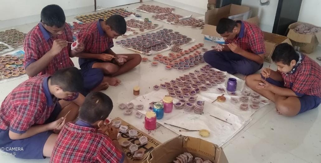 शिक्रापूर : पिंपळे जगताप (ता. शिरुर) येथील सेवाधाम मतिमंद निवासी विद्यालयातील विशेष विद्यार्थ्यांनी काही दिवसांवर येऊन ठेपलेल्या दिवाळ सणासाठी आकर्षक अशा पद्धतीने पणत्या रंगवून आपल्या कलेला वाट मोकळी करुन दिली आहे.
