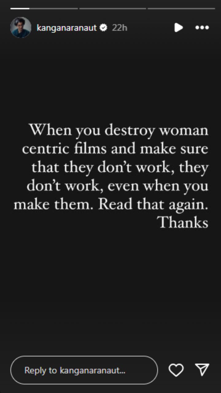 आलिया भट्टचा ‘जिगरा’ हा चित्रपट 11 ऑक्टोबरला चित्रपटगृहात दाखल झाला. करण जोहरच्या प्रोडक्शन हाऊसमध्ये बनलेल्या या चित्रपटाने 4.55 कोटींची कमाई केली आहे. दरम्यान, कंगना रणौतने तिच्या इंस्टाग्राम स्टोरीवर एक पोस्ट शेअर केली आहे. अभिनेत्रीने पोस्टमध्ये लिहिले की, ‘जेव्हा तुम्ही महिला केंद्रित चित्रपटांना उद्ध्वस्त करता आणि ते काम करू शकत नाहीत असे ठरवता, तेव्हा ते कमावण्यास सक्षम नसतात, तुम्ही स्वत: ते बनवले असले तरीही. पुन्हा वाचा. धन्यवाद.’ असे लिहून अभिनेत्रीने ही पोस्ट शेअर केली आहे. कंगना रणौतने तिच्या पोस्टमध्ये कोणाचेही नाव घेतले नसून ते आलिया भट्टच्या ‘जिगरा’ चित्रपटाच्या कमी कलेक्शनशी जोडले जात आहे.