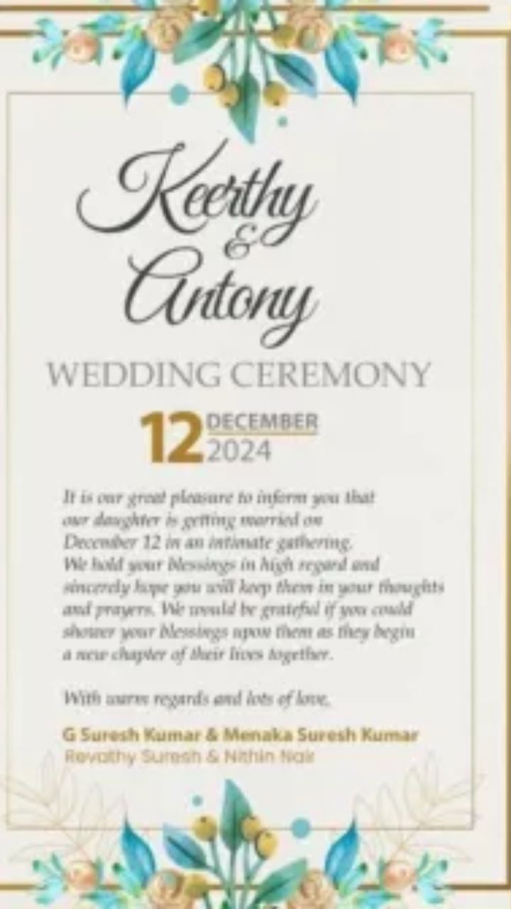 नागा चैतन्य आणि शोभिता धुलिपाला यांनी बुधवारी म्हणजेच 4 डिसेंबर रोजी हैदराबादच्या अन्नपूर्णा स्टुडिओमध्ये सात फेऱ्या घेतल्या. आता दाक्षिणात्य अभिनेत्री कीर्ती सुरेशही लग्नाच्या बेडीत अडकणार आहे. रिपोर्टनुसार कीर्ती सुरेश डिसेंबर महिन्यात तिचा बॉयफ्रेंड अँटोनी थाटीलसोबत लग्नगाठ बांधणार आहे. नुकतीच अभिनेत्रीच्या लग्नाची पत्रिका समोर आली आहे. कीर्ती सुरेशच्या लग्नाचे रजनीकांतसोबत मोठे नाते आहे. ते कनेक्शन काय आहे जे जाणून घेऊयात.