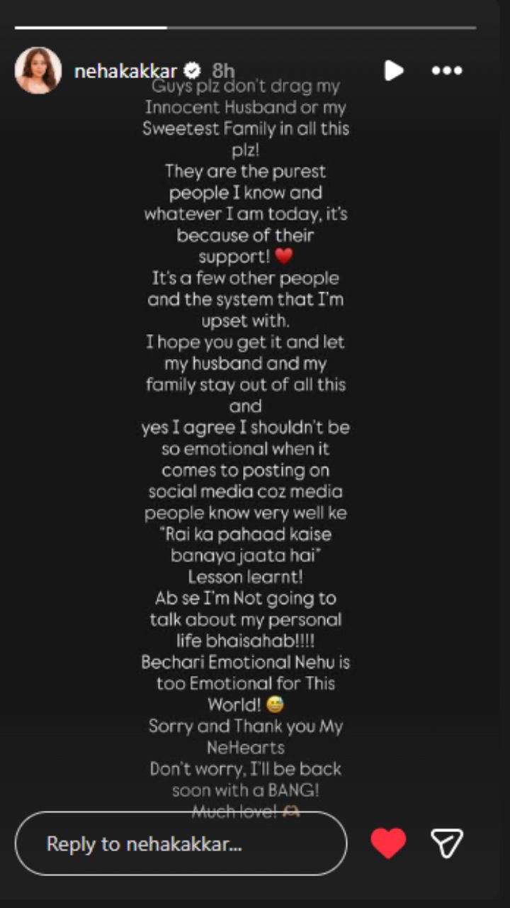 तिने सोशल मीडियावर माफी मागत पुढे लिहिले, “बिचारी भावनिक नेहा या जगासाठी खूप भावनिक आहे. माफ करा आणि धन्यवाद, माझ्या प्रिय मित्रांनो. काळजी करू नका, मी लवकरच परत येईन! खूप खूप प्रेम!” डिलीट केलेल्या पोस्टमध्ये नेहाने लिहिले, “जबाबदारी, नातेसंबंध, काम आणि मी सध्या ज्या सर्व गोष्टींबद्दल विचार करू शकते त्यातून ब्रेक घेण्याची वेळ आली आहे. मला माहित नाही की मी परत येईन की नाही. धन्यवाद.”