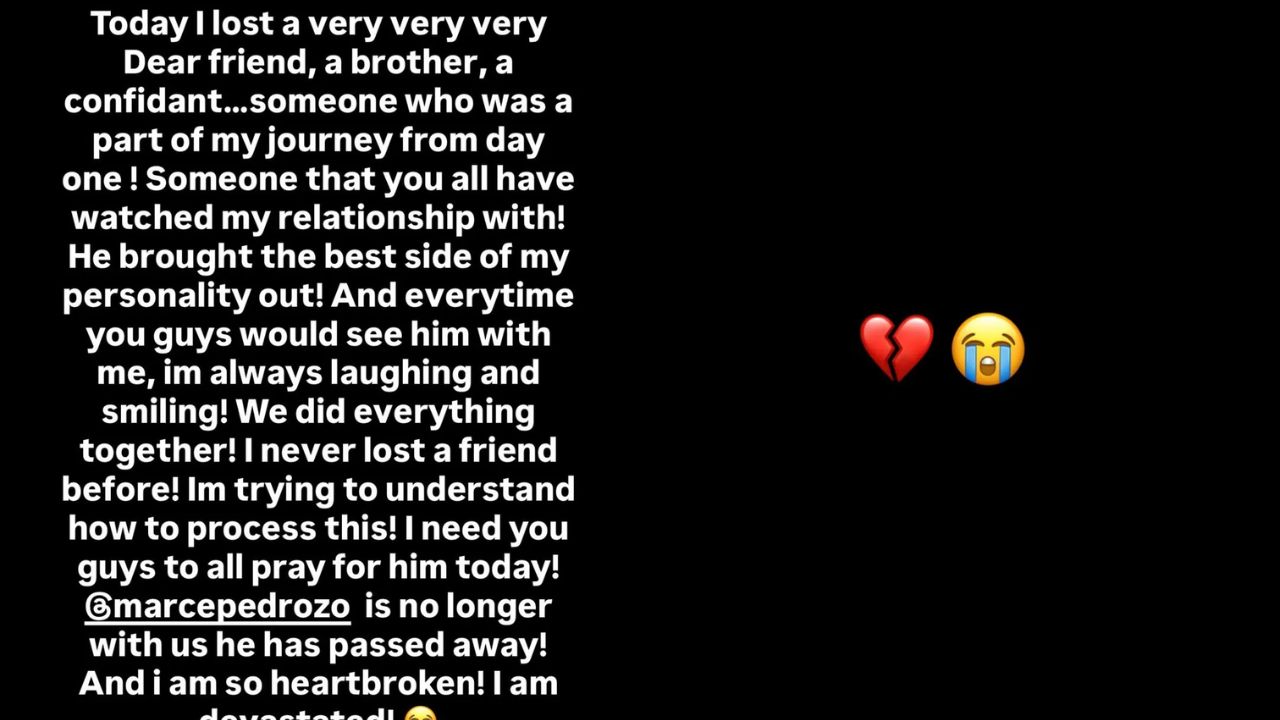 नोरा फतेहीने पुढे स्पष्ट केले की, “आम्ही सर्व काही एकत्र अनुभवले. मी यापूर्वी कधीही अशा मित्राला गमावले नाही. मी हे कसे हाताळायचे हे शोधण्याचा प्रयत्न करत आहे. मी तुम्हाला सर्वांनी त्याच्यासाठी प्रार्थना करावी अशी विनंती करते. मार्से पेड्रोझो आता आपल्यात नाही, तो गेला आहे. आणि माझे हृदय पूर्णपणे तुटले आहे. माझ्यासाठी सर्व काही उद्ध्वस्त झाले आहे.” दुसऱ्या एका स्टोरीमध्ये, नोराने रडणे आणि हृदय तुटल्याचे इमोजी शेअर केले आहेत.