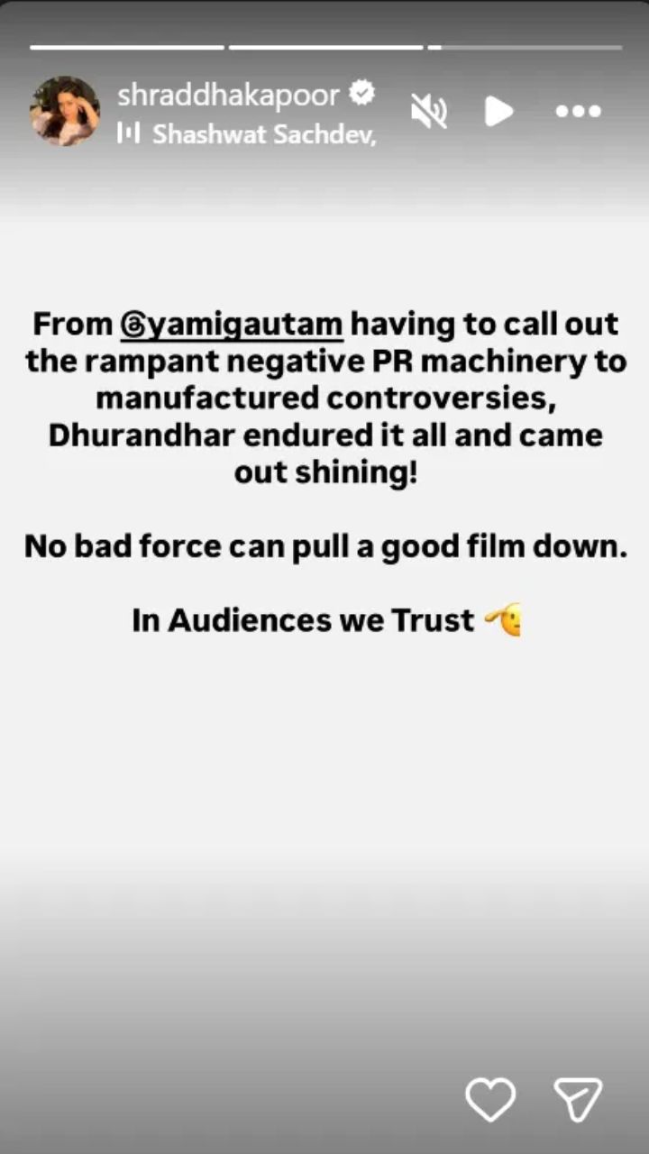 श्रद्धा कपूरने तिच्या इन्स्टाग्रामवर चित्रपटाचे कौतुक करणाऱ्या अनेक स्टोरी शेअर केल्या. तिच्या कथांमध्ये तिने लिहिले, “आदित्य धरने धुरंधर बनवल्याबद्दल मला खरोखर वाईट वाटते, कारण त्याने आम्हाला दुसऱ्या भागासाठी तीन महिने वाट पाहायला लावली आहे. आमच्या भावनांशी खेळू नका. कृपया तो आधी प्रदर्शित करा.” श्रद्धाने चित्रपटाचे कौतुक करत म्हटले की तो किती छान अनुभव होता. जर सकाळी शूटिंग झाले नाही तर ती पुन्हा जाऊन तो पाहेल. या वर्षी हिंदी चित्रपटसृष्टीने पाहिलेल्या हिट चित्रपटांचा उल्लेख करताना अभिनेत्री म्हणाली की “छावा,” “सैयारा,” आणि “धुरंधर” हे सर्व २०२५ मध्ये हिंदी चित्रपटसृष्टीत आहेत.