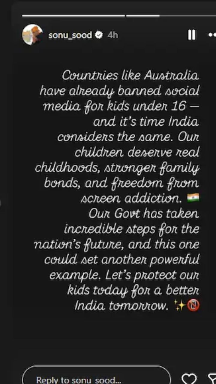 सोनू सूदने इन्स्टाग्रामवर एक पोस्ट शेअर केली आहे, ज्यामध्ये अभिनेत्याने लिहिले आहे की, “ऑस्ट्रेलियासारख्या देशांनी आधीच १६ वर्षांखालील मुलांसाठी सोशल मीडियावर पूर्णपणे बंदी घातली आहे आणि आता भारतातही असेच करण्याची वेळ आली आहे. आपल्या मुलांना खरे बालपण मिळायला हवे. त्यांना त्यांच्या कुटुंबाशी जोडण्याची संधी मिळायला हवी आणि सर्वात महत्त्वाचे म्हणजे स्क्रीनच्या व्यसनापासून मुक्तता मिळायला हवी.” असे अभिनेत्याने लिहिले आहे.
