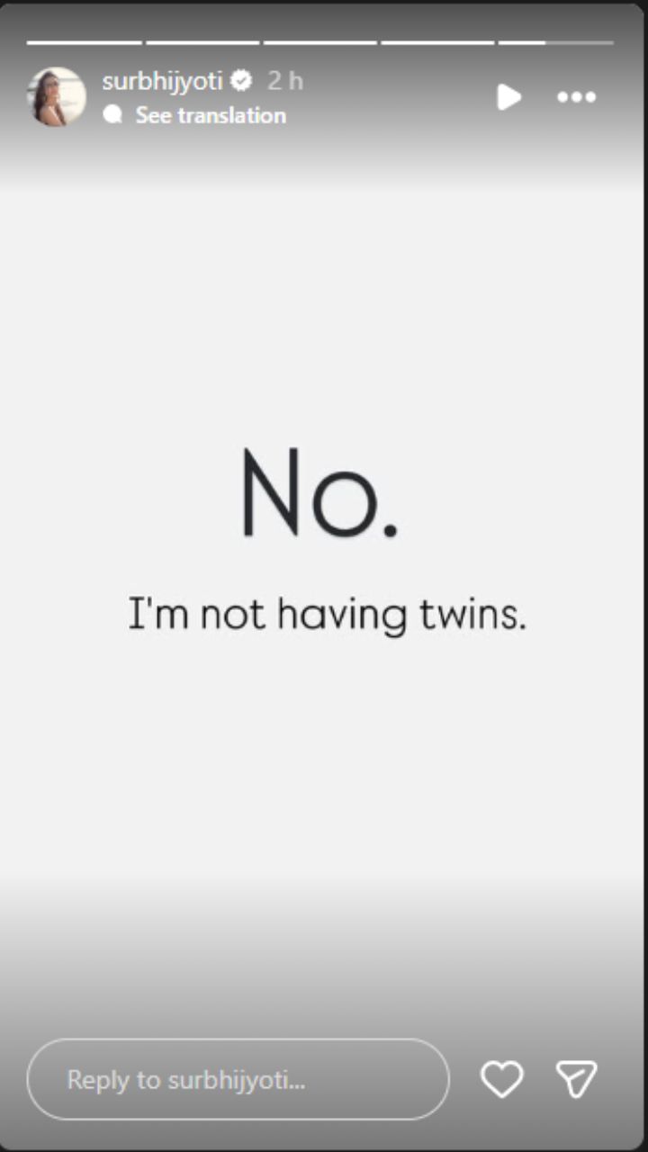 सुरभी ज्योतीने इन्स्टाग्रामवर एक स्टोरी शेअर करून, तिला जुळी मुले होणार आहेत की नाही याबद्दलचे सत्य उघड केले आहे. अभिनेत्रीने इन्स्टाग्रामवर एक स्टोरी शेअर केली, ज्यात लिहिले होते, “नाही, मला जुळी मुले होणार नाहीत.” सुरभी ज्योतीच्या स्टोरीने चाहत्यांच्या चर्चा पूर्णपणे दूर केल्या आहेत. सुरभी ज्योती तिच्या गरोदरपणातील स्वतःचे फोटो शेअर करत आहे. ही अभिनेत्री अनेकदा तिचे बेबी बंप दाखवते आणि सुंदर पोझ देते. तिचे फोटो पाहून हे स्पष्ट होते की, सुरभी ज्योती गरोदरपणात आणखी सुंदर झाली आहे.
