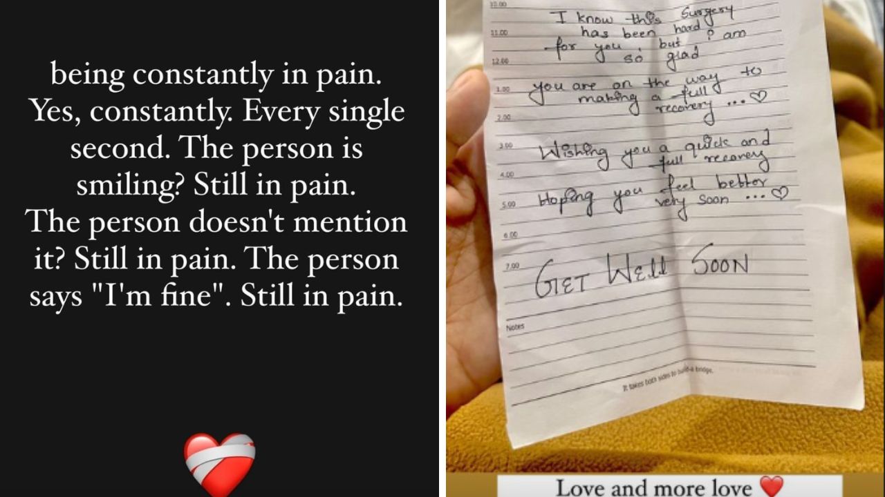 हिनाने इंस्टाग्राम स्टोरीजच्या माध्यमातून चाहत्यांशी तिची वेदना शेअर केली आणि लिहिले, “हो, सतत… प्रत्येक सेकंदाला. ती व्यक्ती हसत आहे? पण त्याला अजूनही वेदना होत आहेत. ती व्यक्ती याबद्दल बोलत नाही? पण त्याला अजूनही वेदना होत आहेत. तरीही ती व्यक्ती म्हणते की ‘मी ठीक आहे.’ पण तरीही त्याला वेदना होतात”. असे हिना खानने तिच्या इंस्टाग्राम स्टोरीला नोट लिहून शेअर केली आहे.