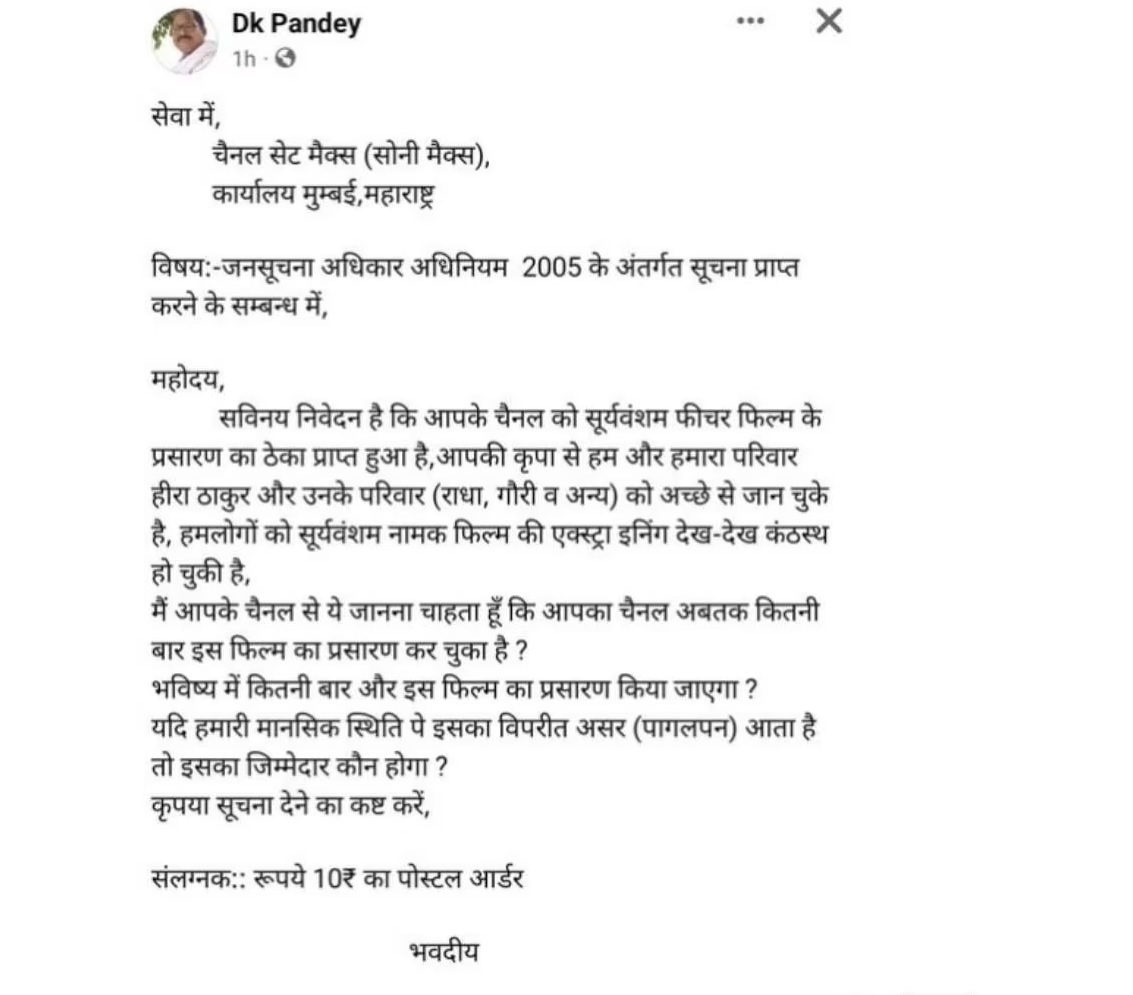 टीव्ही चॅनलला लिहिलेले हे पत्र सोशल मीडियावर खूप व्हायरल होत आहे (सोशल मीडिया सूर्यवंशम पत्र). पत्रात त्या व्यक्तीने नाराजी व्यक्त करत लिहिले की, ‘तुमच्या चॅनलला सूर्यवंशम या फीचर फिल्मच्या प्रसारणाचे कंत्राट मिळाले आहे, तुमच्या कृपेने आम्ही आणि आमचे कुटुंब हीरा ठाकूर आणि त्यांच्या कुटुंबाला चांगल्या प्रकारे ओळखले आहे. आम्ही सूर्यवंशम नावाच्या चित्रपटाची अतिरिक्त खेळी लक्षात ठेवली आहे.