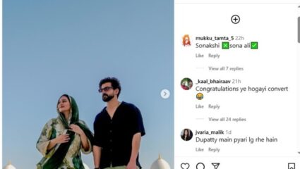 सोनाक्षीने आपल्या पोस्टमध्ये दिलेल्या फोटोमध्ये ती आणि झहीर जास्तीत जास्त वेळ मशिदीच्या बाहेरच आहेत. काही नेटकऱ्यांनी त्यांना मशिदीमध्ये बूट घालून प्रवेश केल्याचा आरोप केला. सोनाक्षीने उत्तर दिले, “म्हणूनच मी माझे बूट घालून आत गेले नाही. नीट पहा, आम्ही मशिदीबाहेर आहोत. आम्ही आत जाण्यापूर्वी त्यांनी आम्हाला आमचे बूट कुठे ठेवायचे ते दाखवले आणि आम्ही ते काढले. मला तेवढे माहिती आहे. सोनाक्षीने फोटो शेअर केले आणि लिहिले, “मला अबू धाबीमध्ये शांती मिळाली आहे.”