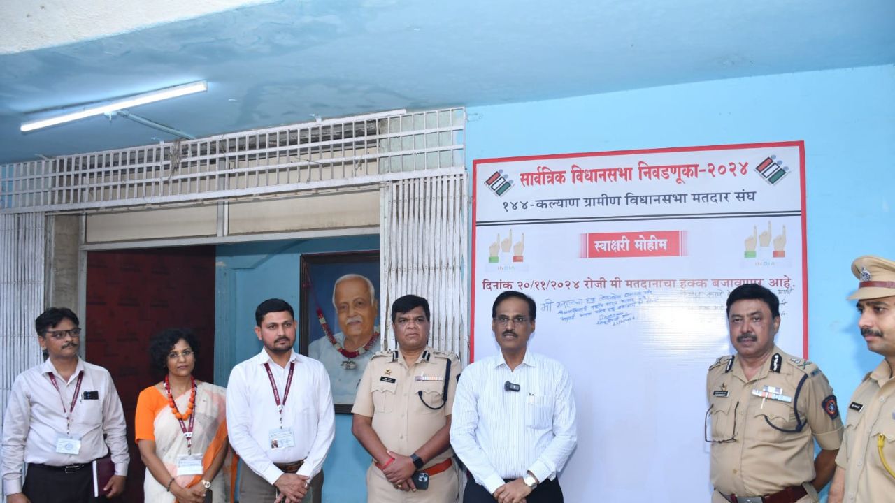 जिल्हा निवडणूक अधिकारी अशोक शिनगारे व ठाणे पोलीस आयुक्त आशुतोष डुंबरे यांनी सावळाराम महाराज म्हात्रे क्रीडा संकुलात त्यांनी मतदानाचा हक्क बजाविण्याबाबत आवाहन केलं आहे. यासाठी त्यांनी कल्याण ग्रामीण मतदार संघाच्या कॅन्व्हासवर आपल्या स्वाक्षरीची मोहर उमटविली. यावेळी अतिरिक्त पोलीस आयुक्त संजय जाधव, परिमंडळ-3 चे पोलीस उपआयुक्त अतुल झेंडे, कल्याण ग्रामीण विधानसभा मतदार संघाचे निवडणूक निर्णय अधिकारी विश्वास गुजर, सहा.निवडणूक निर्णय अधिकारी श्रध्दा चव्हाण, राजु राठोड, संजय भोये तसेच निवडणूक कर्तव्यावरील इतर अधिकारी व कर्मचारी वर्ग उपस्थित होता.