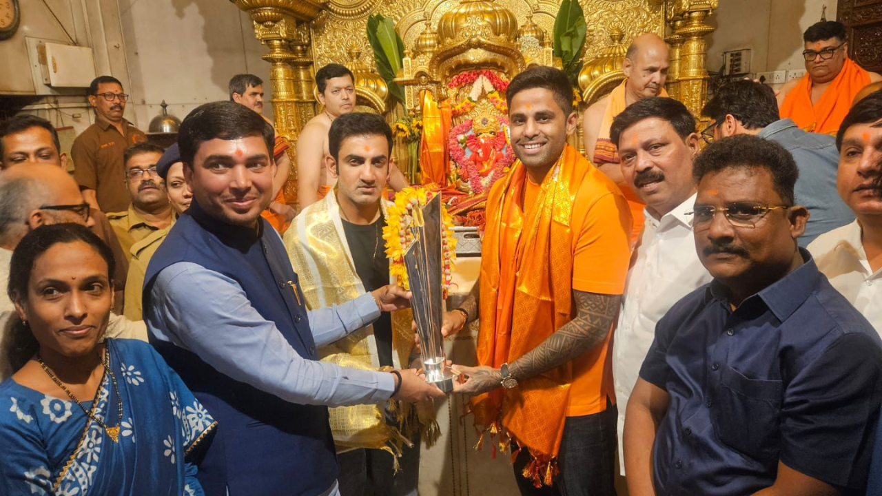 टीम इंडियाचे मुख्य प्रशिक्षक गौतम गंभीर आणि कर्णधार सूर्यकुमार यादव यांनीही मुंबईचं दैवत सिद्धीविनायकाचं दर्शन घेतलं. दोघंही विश्वचषकाची ट्रॉफी घेऊन बाप्पाच्या चरणी पोहोचले आणि बाप्पासमोर नतमस्तक झाले. सध्या त्यांचे फोटो सोशल मीडियावर व्हायरल होत आहेत.