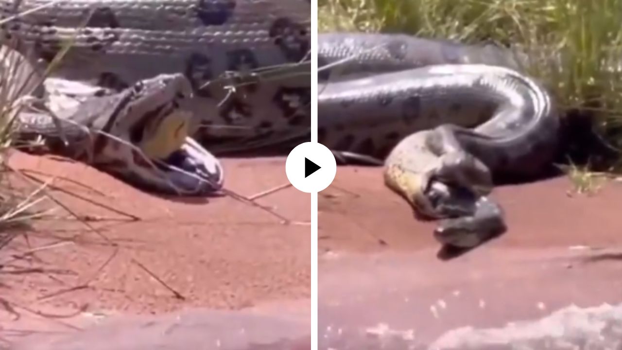 सोशल मीडियावर सध्या एक थरारक दृश्य शेअर झाले आहे ज्यातील दृश्ये तुमच्या अंगाचा थरकाप उडवतील. वास्तविक, सोशल मीडिया एक असे प्लॅटफॉर्म आहे जिथे नेहमीच अनेक वेगवेगळ्या प्रकारचे व्हिडिओज शेअर होत असतात. इथले बरेच व्हिडिओज आपल्या कल्पनेपलीकडचे ठरतात आणि म्हणूनच कमी वेळेत ते आपले लक्ष वेधतात. असाच लक्षवेधी ठरणारा एक थरारक व्हिडिओ नुकताच इथे शेअर झाला आहे ज्यात एका ॲनाकोंडाने दुसऱ्या ॲनाकोंडाला गिळंकृत केल्याचे भयावह दृश्य दिसून आले आहे. ॲनाकोंडा जंगलातील सर्वात धोकादायक प्राणी आहे त्याच्या विशाल शरीराच्या जोरावर तो जंगलातील अनेक प्राण्यांची शिकार करतो खरी पण त्याची ही शिकार आता सर्वांनाच आश्चर्याचा धक्का देत आहे. बरं स्वतःच्याच प्रजातीतील जीवाला खाल्ल्यानंतर आता पुढे या दृश्यात नक्की काय घडून आलं ते आपण सविस्तर जाणून घेणार आहोत.