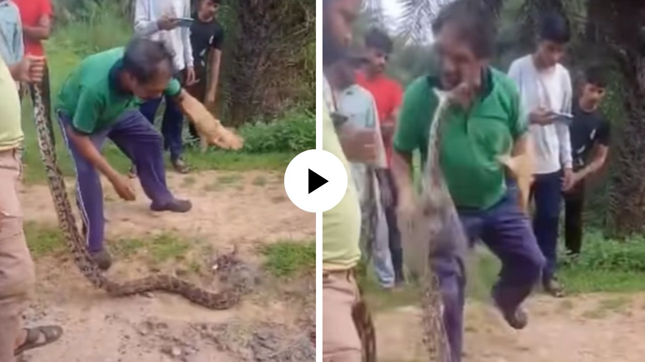 व्हायरल व्हिडिओमध्ये तुम्ही पाहू शकता यात एक हातमोजे घातलेला एक व्यक्ती एका मोठ्या अजगराला पकडण्याचा प्रयत्न करताना दिसत आहे. असे दिसते की गावकऱ्यांनी या मोठ्या सापाला पकडण्यासाठी या सर्पमित्राला बोलावले होते. पण अजगराला पकडण्यासाठी आलेल्या या सर्पमित्रावरच अजगर भयानक हल्ला करतो. अजगर जाळ्यात अडकला होता आणि दुसऱ्या एका व्यक्तीने त्याची शेपटी धरली होती. पण अजगराला पकडण्याआधीच तो उंच उडी मारत व्यक्तीच्या अंगावर चढतो आणि त्याच्या गालावर जोरदार दंश करतो. तब्बल ४० सेकंद अजगर व्यक्तीच्या गालाचा चावा घेत राहतो. हे सर्वच इतके थरारक दिसत होते की तिथे उपस्थित लोकही यामुळे घाबरतात पण काही लोक सर्पमित्राच्या मदतीसाठी पुढे येतात ज्यामुळे अजगराच्या तावडीतून त्याची सुटका करण्यात येते. दरम्यान ही घटना नक्की कुठली आणि कधीही आहे याबाबत कोणतीही अधिकृत माहिती मिळालेली नाही.