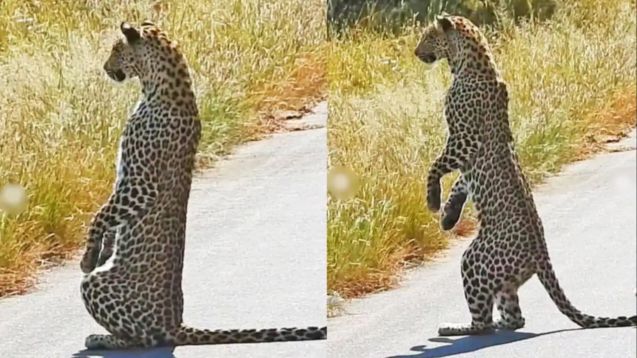 सध्या असाच एक व्हिडिओ सोशल मीडियावर मोठ्या प्रमाणात व्हायरल होत आहे. यामध्ये एका बिबट्याने असे काही केले आहे की, ज्याची कुणी कल्पना देखील केली नव्हती. हा व्हिडिओ पाहून अनेकांना आश्चर्य वाटले आहे. हा व्हिडिओ दक्षिण आफ्रिकेतील प्रसिद्ध क्रुगर राष्ट्रीय उद्यानातील आहे. यामध्ये एक बिबट्या माणसांसारखे त्याच्या पायांवर अगदी सरळ ताठ मान करुन उभा आहे. हे दृश्य कुमाना धरणाजवळील सफारीला गेलेल्या मेरी टार्डनेने केले आहे.