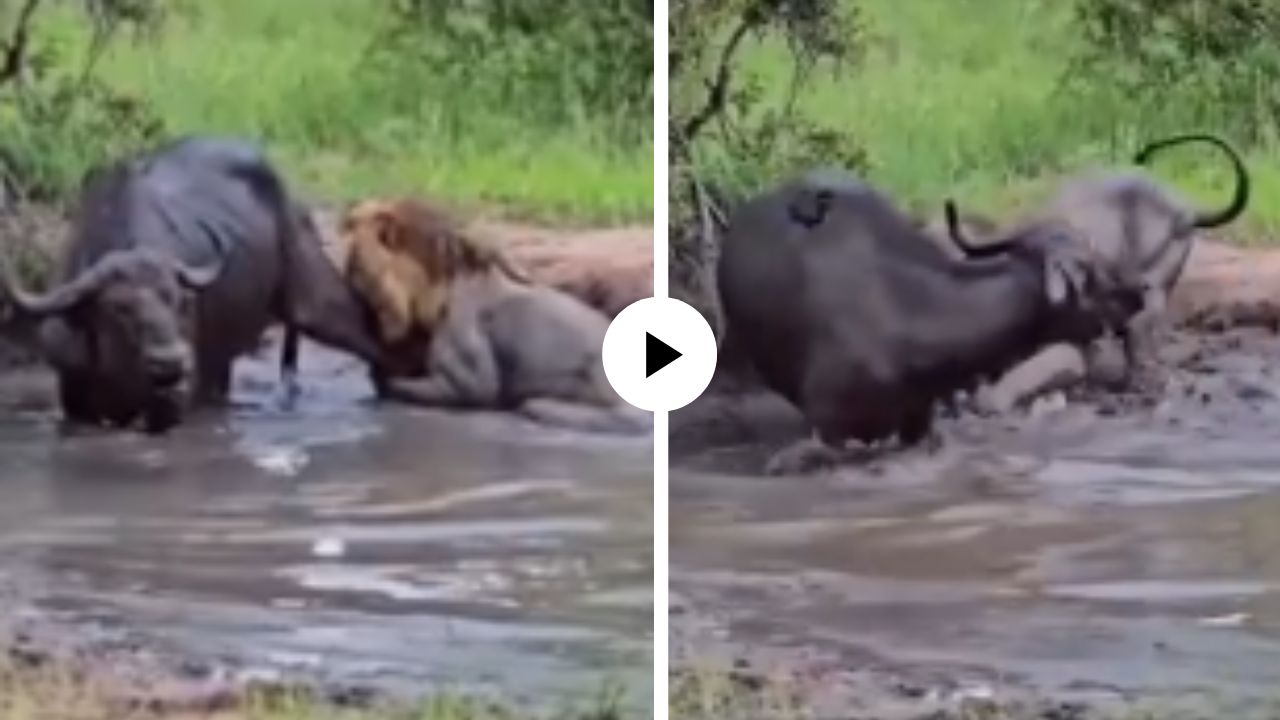 कारण सिंह हा जंगलाचा राजा आहे. सिंहाच्या तावडीत सापडल्यास सुटका होणे अगदी अशक्यच आहे. परंतु अनेकदा नशीब पालटते. तुम्ही शिकारीच शिकार होताना अनेकदा पाहिले असेल. असेच काहीसे या सिंहासोबत इथे घडले आहे. या व्हिडिओमध्ये तुम्ही पाहू शकता की, एक पाण्याचे तळ दिसत आहे. यामध्ये एक म्हैस दिसत आहे. तसेच इथेच एक सिंह दिसत आहे. सिंहाने म्हशीवर झडप घातली आहे. म्हशीच्या पायाचा चावा सिंह घेत आहे. म्हैस आपल्या जीव वाचवण्यासाठी आपला पाय ओढत आहे. जोराजोरात ओरडत आहे. पण सिंहाची पकड खूप मजबूत आहे. इतक्यात सिंह अचानक म्हशीला सोडून बाजूला होतो आणि तिथून पळ काढतो. कारण दुसऱ्या बाजूने म्हशींचा कळप येतो. तुम्ही पाहू शकता की, म्हैस आपला जीव वाचवण्यासाठी प्रयत्न करत आहे, ओरडत आहे. कदाचित तिचा आवाज ऐकूनच म्हशींचा कळप तिथे आला असावा.