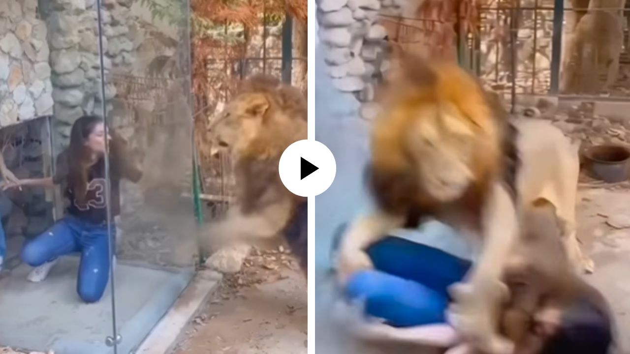 व्हायरल व्हिडिओमध्ये तुम्ही पाहू शकता यात एक मुलगी काचेच्या बॉक्समध्ये बसून बाहेर उभ्या असलेल्या सिंहाला हिणवत असते. सिंह तिच्याकडे एकटक बघत असतो आणि मुलगी काचेच्या बॉक्समध्ये बसून त्याला हातवारे करून हिणवत असते. परिणामी सिंह भडकतो आणि पूर्ण ताकदीने काचेच्या पेटीवर पंजे मारून त्याला फोडून टाकतो. आता हा काचेचा बॉक्स फुटताच मुलगी यातून बाहेर पडते आणि क्षणाचाही विलंब न करता सिंह तिला पकडून मागे खेचून बाहेर काढतो. व्हिडिओमध्ये पुढे अनेक मजेदार गोष्टी घडतात ज्या तुमच्या चेहऱ्यावर हसू आणू शकतात. व्हिडिओमध्ये सिंहाने मुलीला पकडलेलं असतानाच तिथे एक माणूस सिंहाचा वेष करून तिथे येतो आणि मुलीला पकडू लागतो. अशात मुलगी जमिनीवर पडलेली असते आणि सिंह आणि सिंहाचा वेष घेतलेल्या व्यक्तीने तिला पकडलेलं असतं.