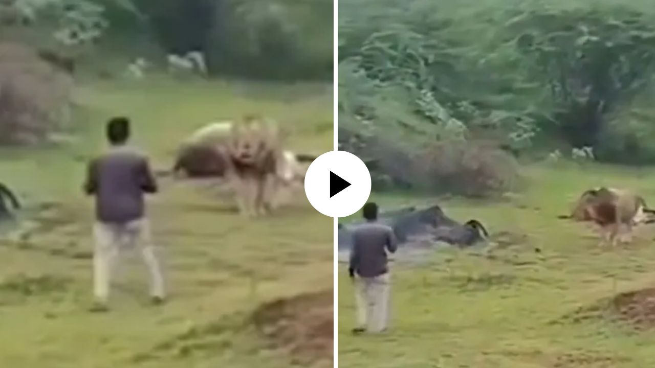 ही घटना गुजरातमधील आहे. गुजरातच्या भावनगरमध्ये एक तरुण सिंहाजवळ त्याच्या शिकारीचा व्हिडिओ आणि फोटो काढायला गेला होता, परंतु त्याच्या या कृत्यावर जंगलाचा राजा सिंह चांगलाच भडकला आहे. व्हायरल होत असलेल्या व्हिडिओमध्ये तुम्ही पाहू शकता की, हिरवागार जंगलाचा घनदाट परिसर दिसत आहे. येथेच एक सिंह आपल्या शिकारीचा आनंद लुटत आहे. याच वेळी एक तरुण याचा व्हिडिओ बनवण्यासाठी त्या सिंहाजवळ जातो. तरुणाला पाहताच सिंह त्याच्या दिशेने धाव घेतो. यामुळे तरुणाला उलटे माघारी परतावे लागते. सुदैवाची बाबा म्हणजे सिंहाने तरुणावर हल्ला केलेला नाही, परंतु जर सिंहाने हल्ला केला असता तर यामुळे त्याचा जीवही गेला असता.