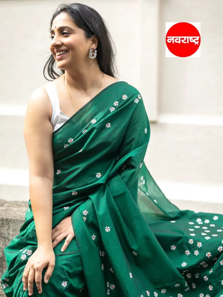 मधुराणीने शेअर केलेल्या या साडीतल्या फोटोवर प्राजक्ताच्या फुलांची डिझाईन आहे.