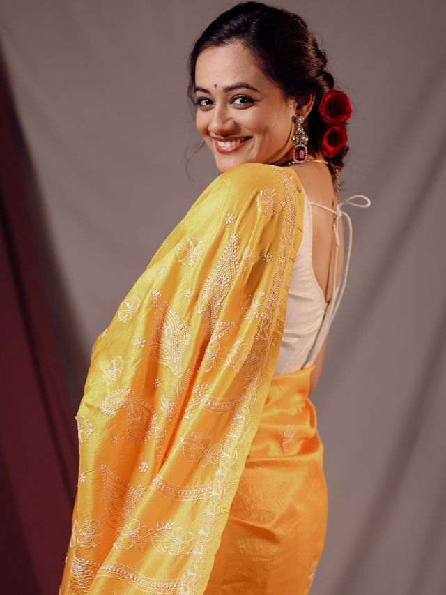 पिवळ्या रंगाच्या चिकनकारी साडीवर अभिनेत्रीने व्हाईट कलरचा स्टायलिश ब्लाऊज वेअर केलेला आहे.