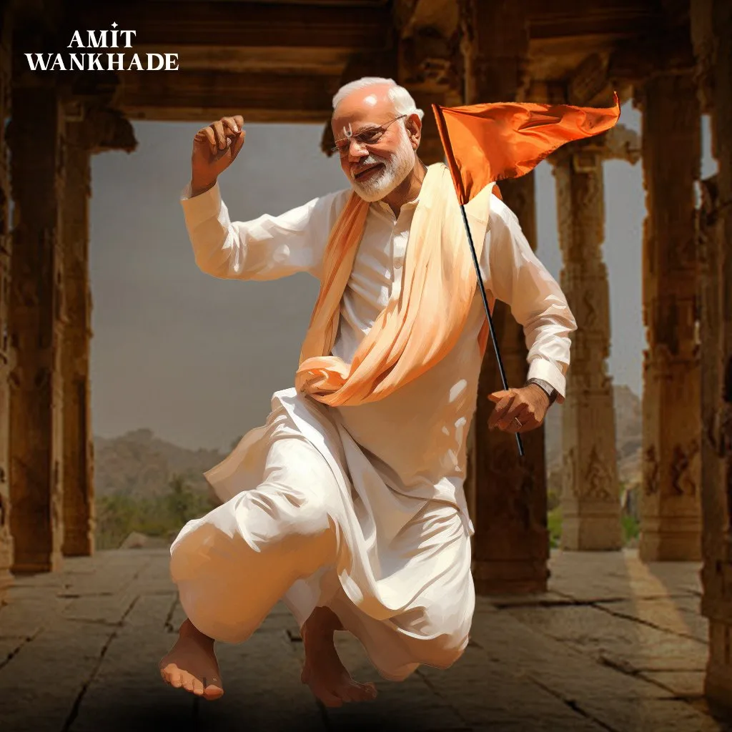 पंतप्रधान नरेंद्र मोदींचे आषाढी वारीतील हातात पताका घेतलेले अर्कचित्र अमित यांनी साकरले आहे