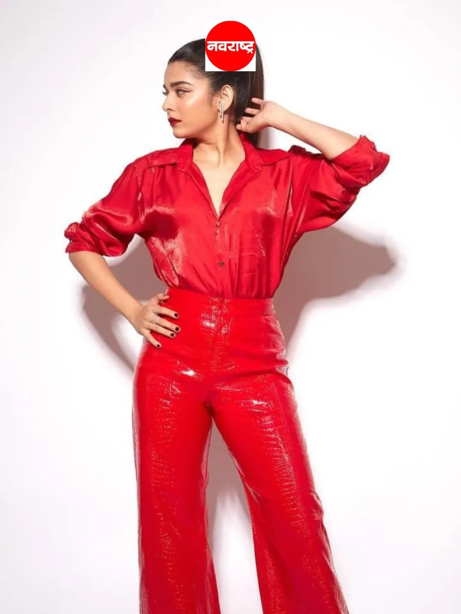 रेड लेदर जॅकेट आणि रेड पँट मिथिलाने वेअर केली आहे.