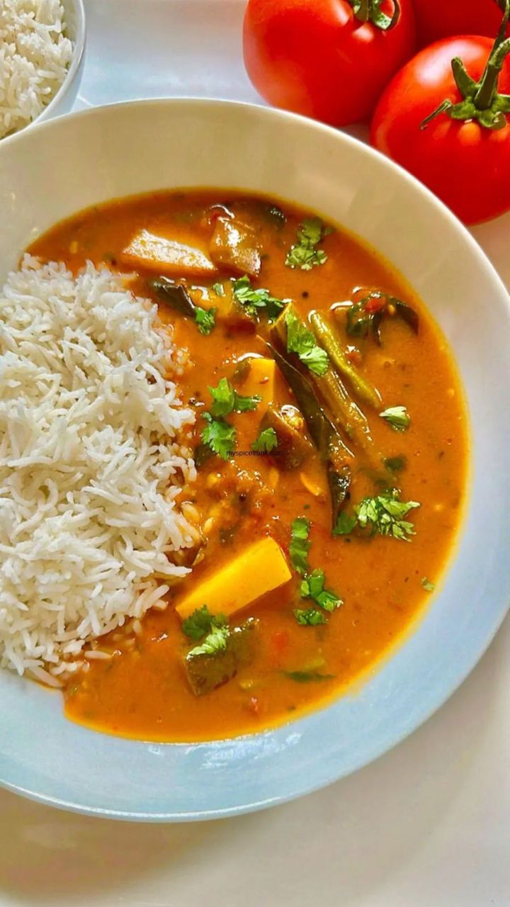 बेसन, चिंचेच पाणी, बटाटा, भेंडी, गाजर, मटर, टोमॅटो, हिरवी मिरची, आलं