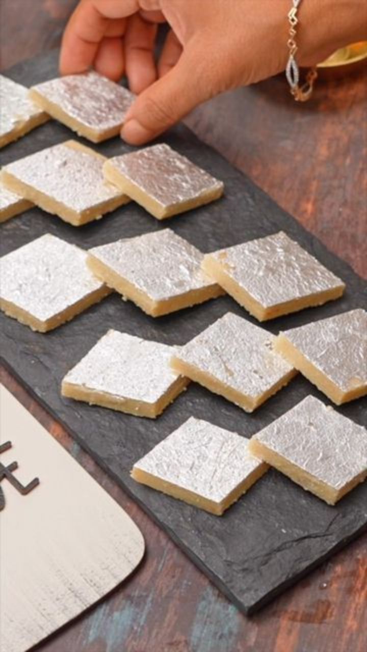 चाकूने डायमंड शेपमध्ये कापा आणि वर चांदीचा वर्ख लावा. थंड झाल्यावर साठवून ठेवा.
