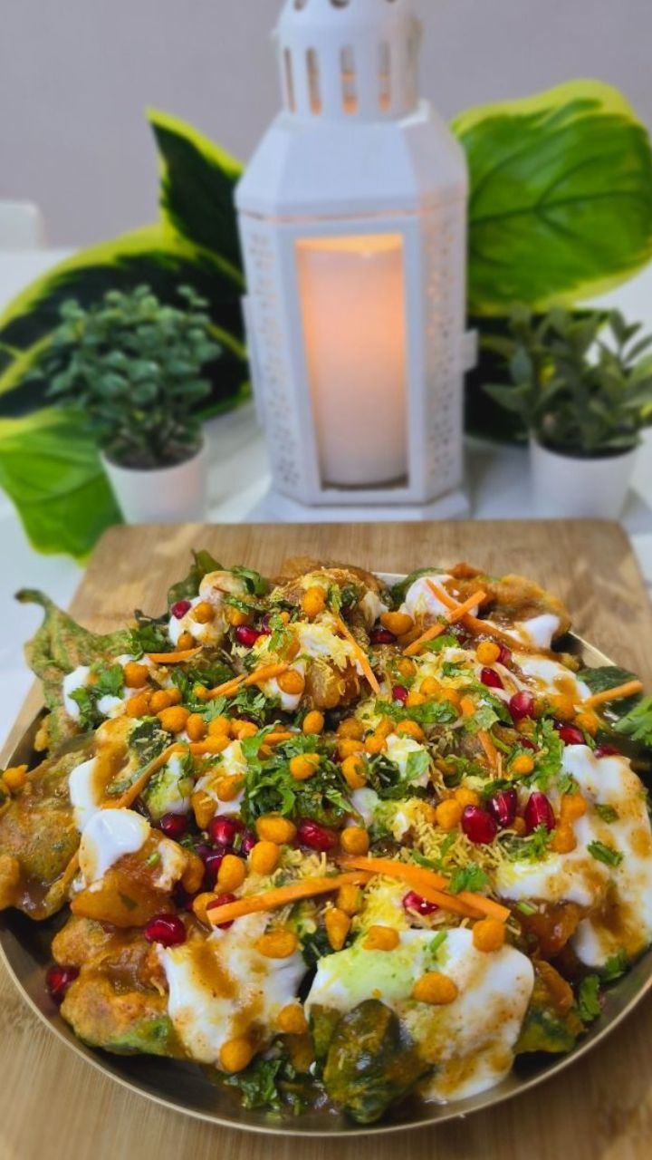 सर्व्हिंग प्लेटमध्ये तळलेली पाने ठेवा. त्यावर फेटलेले दही, हिरवी चटणी आणि चिंचेची गोड चटणी घाला.
