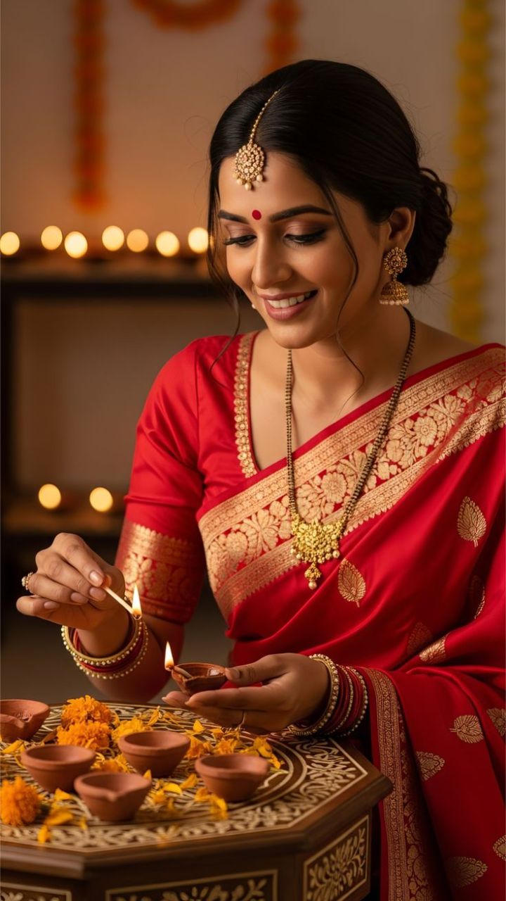 दिवाळीचा प्रकाश पांढऱ्या, क्रीम आणि पेस्टल रंगाच्या कपड्यांवर अधिक चांगला दिसतो.