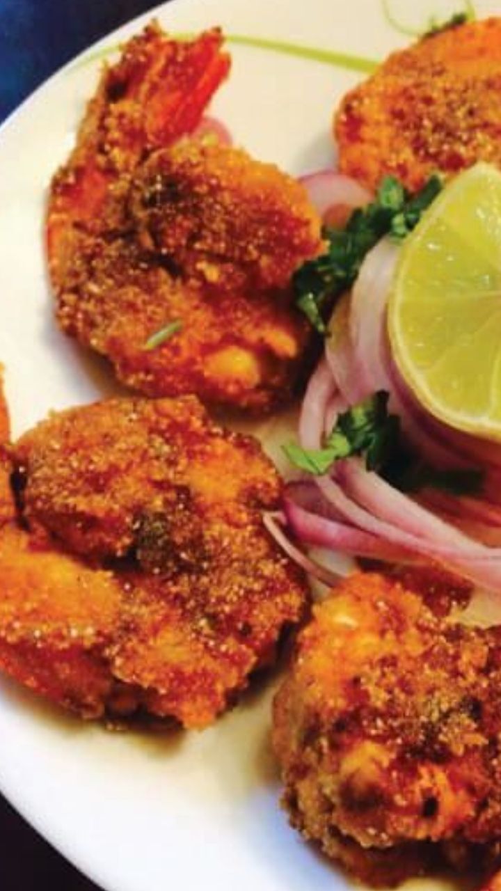 तळलेले प्रॉन्स गरमागरम कांदा, लिंबाचे काप आणि हिरवी चटणीसोबत सर्व्ह करा.