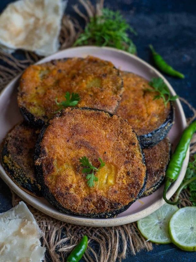 गरमागरम बेगुन भाजा तयार आहे. हे भजा भात, डाळ किंवा वरण-भातासोबत सर्व्ह करा.