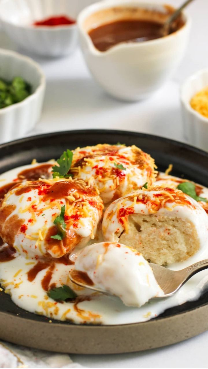 एका प्लेटमध्ये वडे ठेवून त्यावर भरपूर दही घाला. त्यावर चिंचेची गोड चटणी आणि हिरवी चटणी पसरवा.
