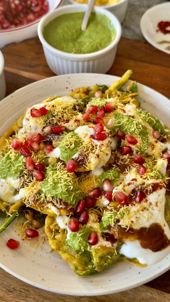 हिरवी चटणी आणि गोड चिंचेची चटणी वरून ओतून घ्या. हवे असल्यास थोडी तिखट चटणीही घालू शकता.