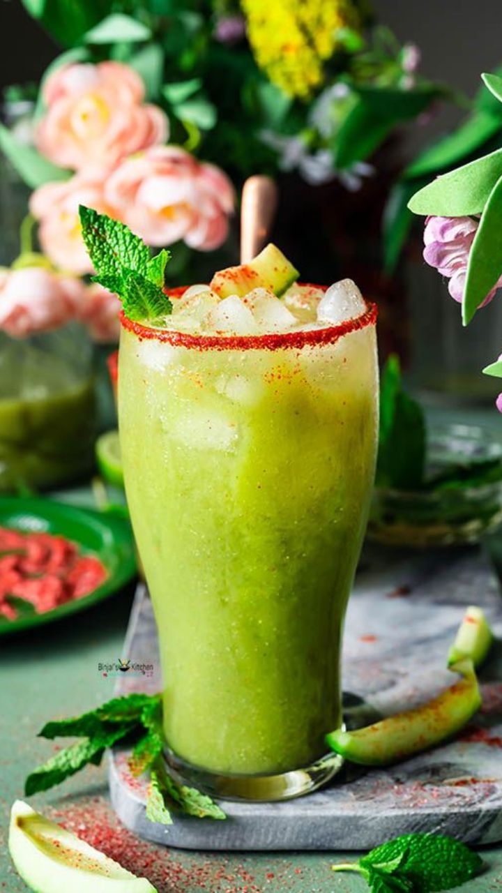 ग्लासमध्ये बर्फ घालून आम पन्ना ओता आणि वरून पुदिन्याची पाने घालून सर्व्ह करा.