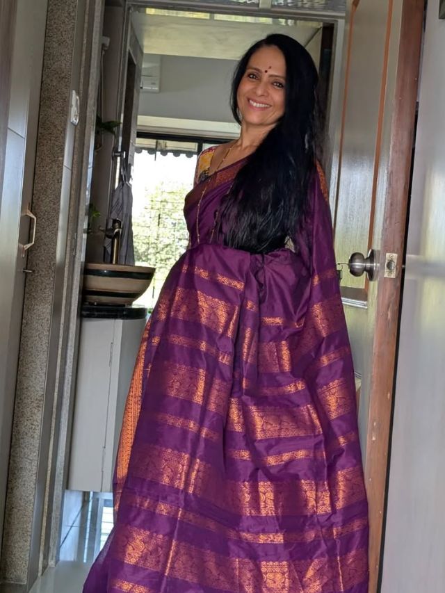 शेअर केलेल्या नव्या फोटोंमध्ये ऐश्वर्या यांनी जांभळ्या रंगाची साडी नेसली आहे.