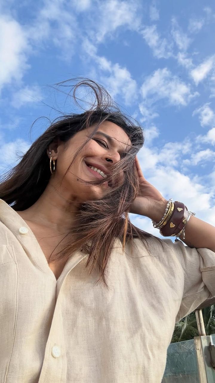 श्रेयाने शेअर केलेल्या फोटोमध्ये जीन्स आणि ब्राउन प्लास्टर रंगाचं शर्ट घातले आहे.