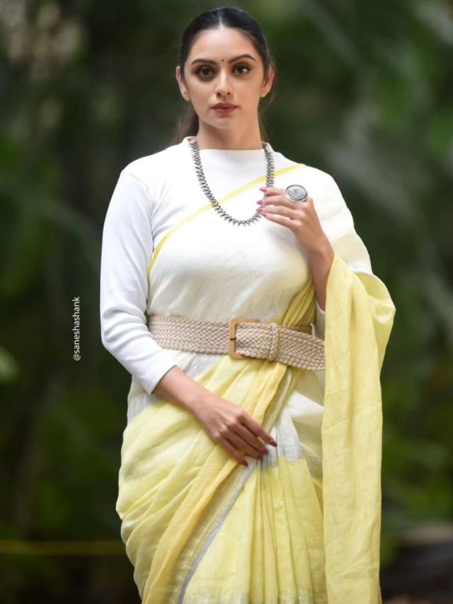 लाईट येल्लो कलरची साडीतील लूकवर श्रुतीने पांढऱ्या रंगाचा टी-शर्ट ब्लाऊज परिधान केला आहे.