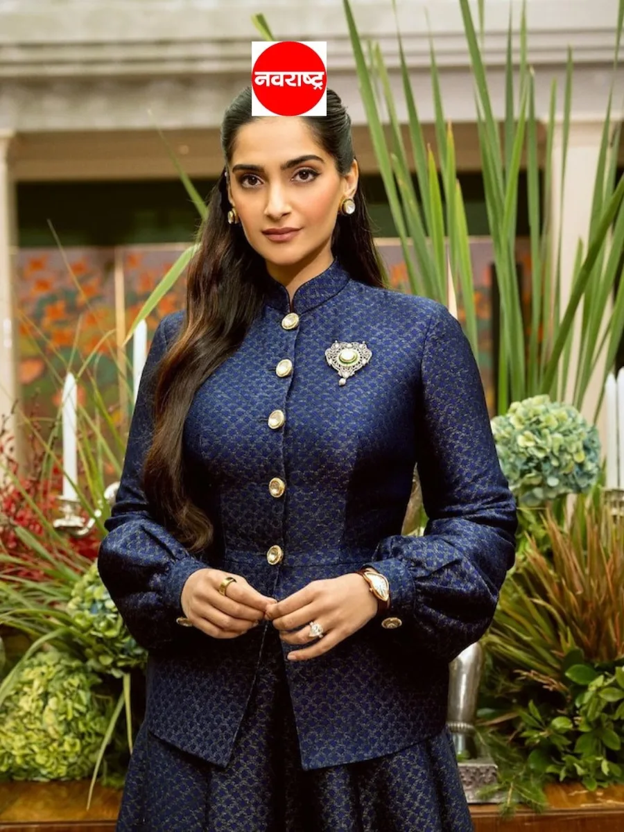 सोनमने निळ्या रंगाचे जॅकेट आणि मॅचिंग स्कर्ट वेअर केलेला आहे.