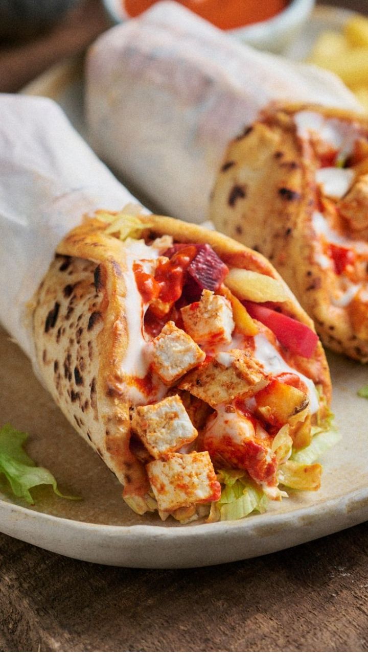 ब्रेड नीट रोल करा, अर्धा कापून गरमागरम पनीर शावरमा सर्व्ह करा.
