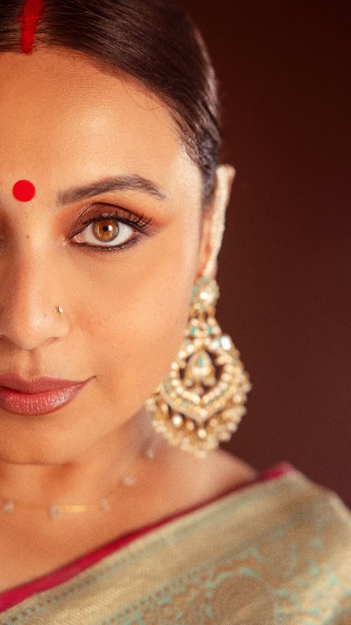 राणी मुखर्जीने साडीवर साधा आणि मोहक मेकअप केला आहे. तसेच, लाल लिपस्टिक, भांगेत सिंदूर आणि आयशॅडो लावला आहे.
