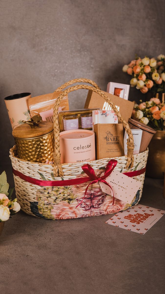 फेस मास्क, बॉडी लोशन, बाथिंग प्रॉडक्ट्स असलेला छोटा Self-care हँपर
